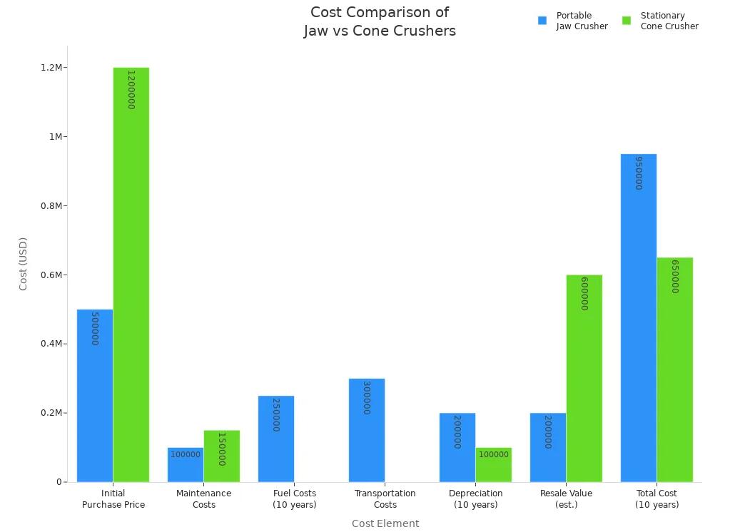Cost Element Portable Jaw Crusher ($) Stationary Cone Crusher ($) Initial Purchase Price 500,000 1,200,000 Maintenance Costs 100,000 150,000 Fuel Costs (10 years) 250,000 – Transportation Costs 300,000 – Depreciation (10 years) 200,000 100,000 Resale Value (est.) 200,000 600,000 Total Cost (10 years) 950,000 650,000