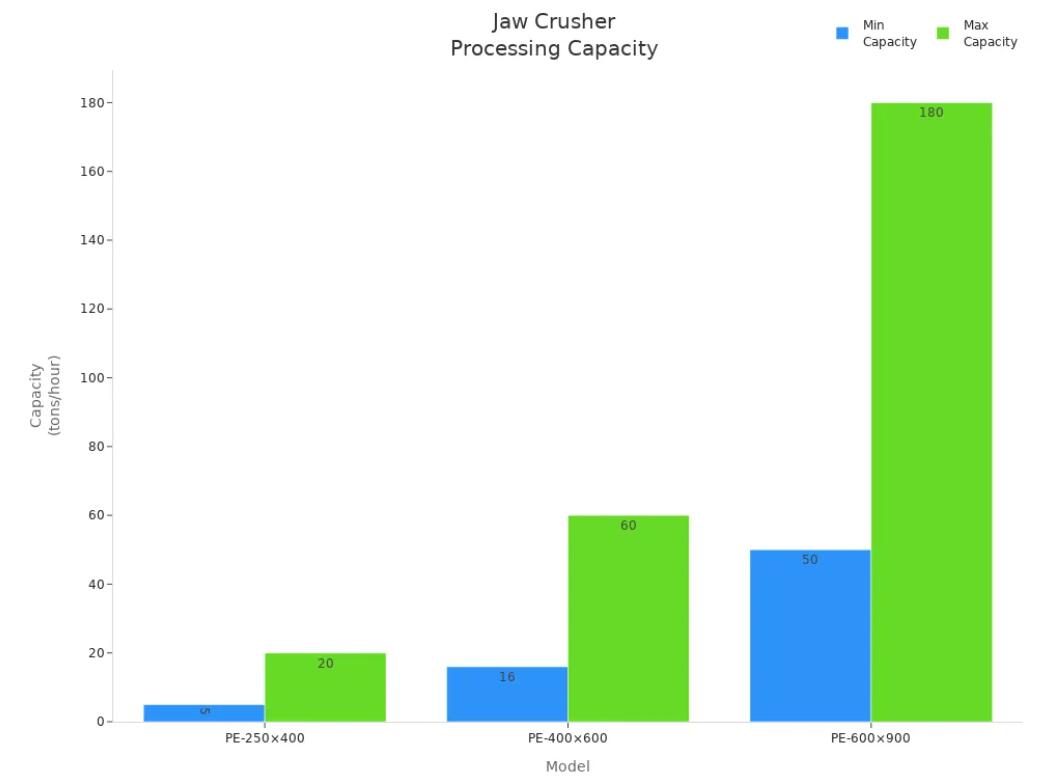 Jaw crushers give you flexibility in feed size and output. Actual production capacity changes with rock type, density, and feeding arrangements. You should match the jaw crusher size and capacity to your specific rock processing needs.