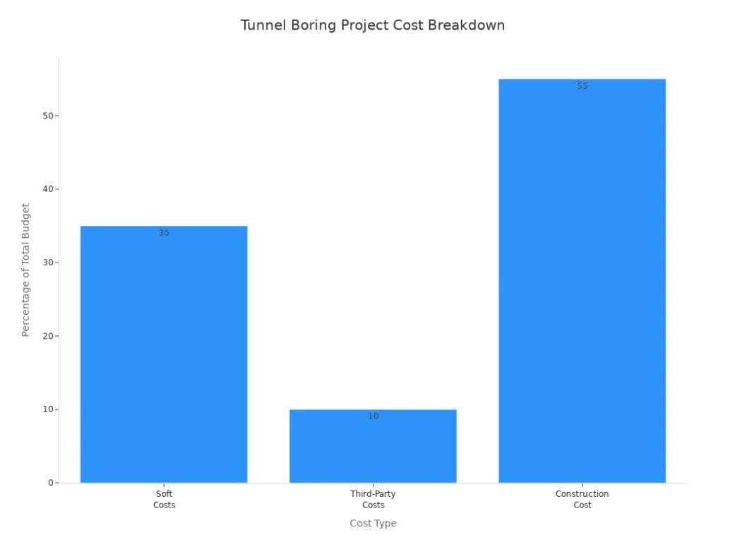 You have many costs to think about when you plan a tunnel boring project. The main costs are buying or renting a tunnel boring machine, paying workers, getting tunnel boring equipment, and soft costs like permits and insurance. Direct costs usually come from building work. Soft costs pay for project management and following rules. The table below shows how much each cost type adds to the total budget: