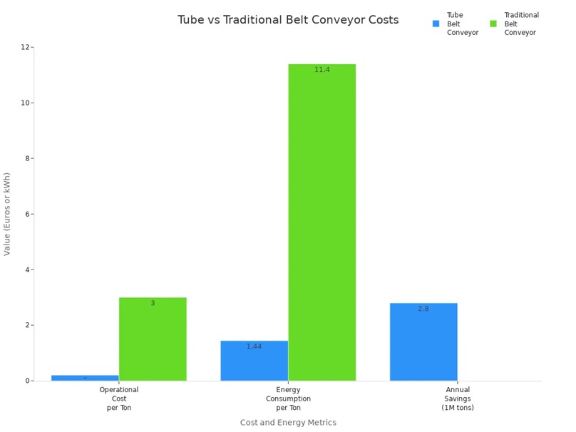 Tube conveyor systems use only 1.44 kWh per ton. Traditional belt conveyors use 11.4 kWh per ton. You spend less money for each ton moved. Over a year, you can save up to 2.8 million Euros if you move one million tons.